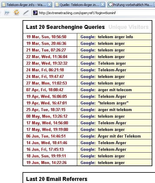 Als ich diese Website Ende 2005 einrichtete, um anderen von der Telekom-Mafia geschädigten Informationen zur Selbsthilfe anzubieten, meldete ich die Seite natürlich sofort bei Suchdiensten wie Lycos, Yahoo, Fireball, Altavista und natürlich auch Google an. Beim Kontrollieren der Suchmaschinen-Zugriffe fiel mir bald auf, dass von Google nur Zugriffe mit den beiden im Domain-Namen enthaltenen Suchwörtern „telekom“ und „ärger“ erfolgten, was mich natürlich stutzig machte.