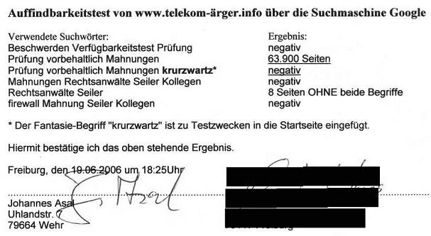 Ich gab also bei Google verschiedene Suchwort-Kombinationen ein, von denen ich sicher war, dass sie von vielen Nutzern eingegeben wurden, z.B. „Rechtsanwälte Seiler“ oder „Seiler Kollegen“. Wie erwartet wurden mehrere Zehntausend Treffer angezeigt. Um nun herauszufinden, ob meine Seite auch unter den Treffern ist, benutzte ich ein Prinzip aus der Mengenlehre: Wenn meine Seite unter den -zigtausend Treffern wäre, und zusätzlich zu den häufig vorkommenden Begriffen noch ein weiterer eingegeben würde, der NUR auf www.telekom-ärger.info enthalten ist, müsste die Schnittmenge der Suchbegriffe genau einen Treffer ergeben.
